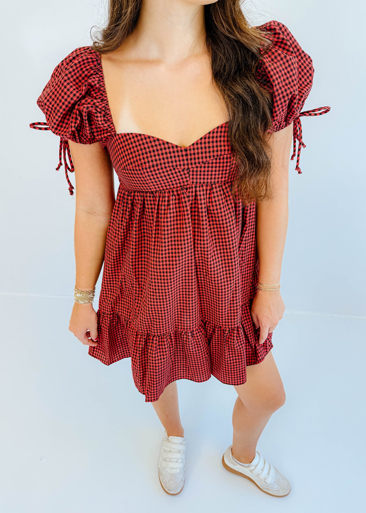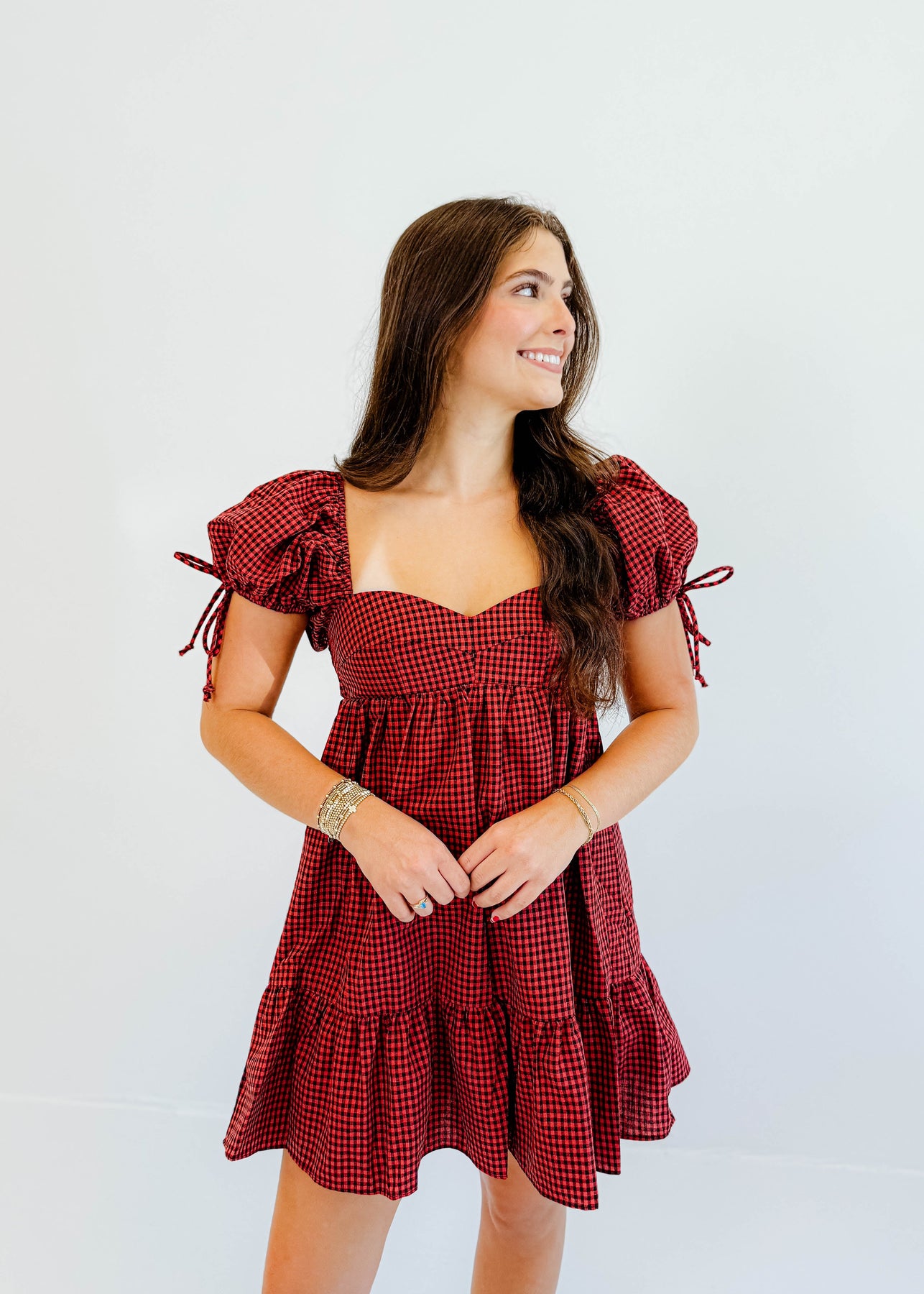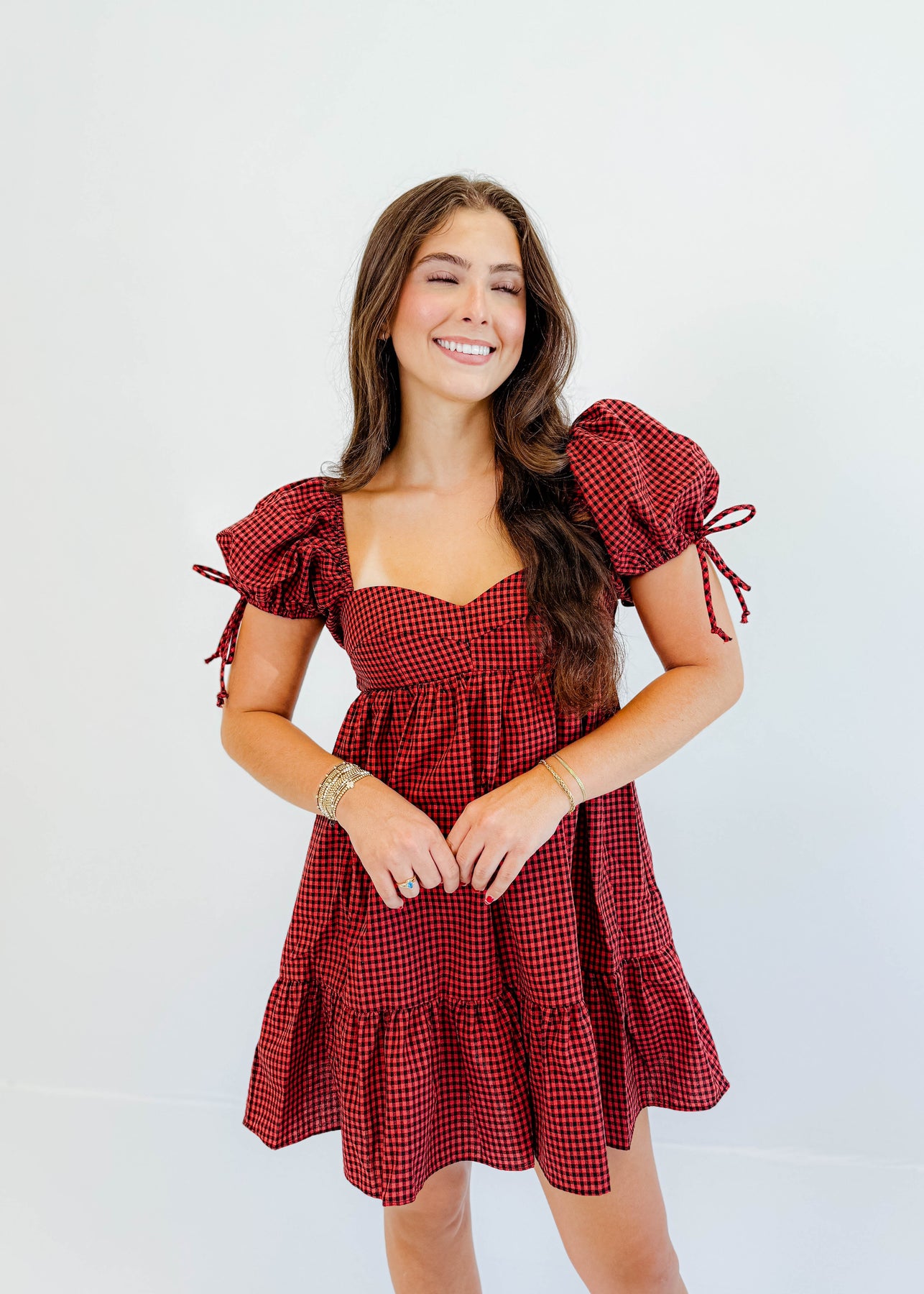 The Clara Gingham Babydoll Dress brings timeless charm with a playful twist. Its puff sleeves with delicate tie details frame a flattering sweetheart neckline, while the tiered skirt adds just the right amount of movement for any occasion. The classic gingham pattern gives it a nostalgic yet modern vibe, making it easy to style for casual days or dressed-up moments. Pair Clara with flats for an afternoon stroll or heels for a night out — she’s the kind of dress you’ll reach for again and again.