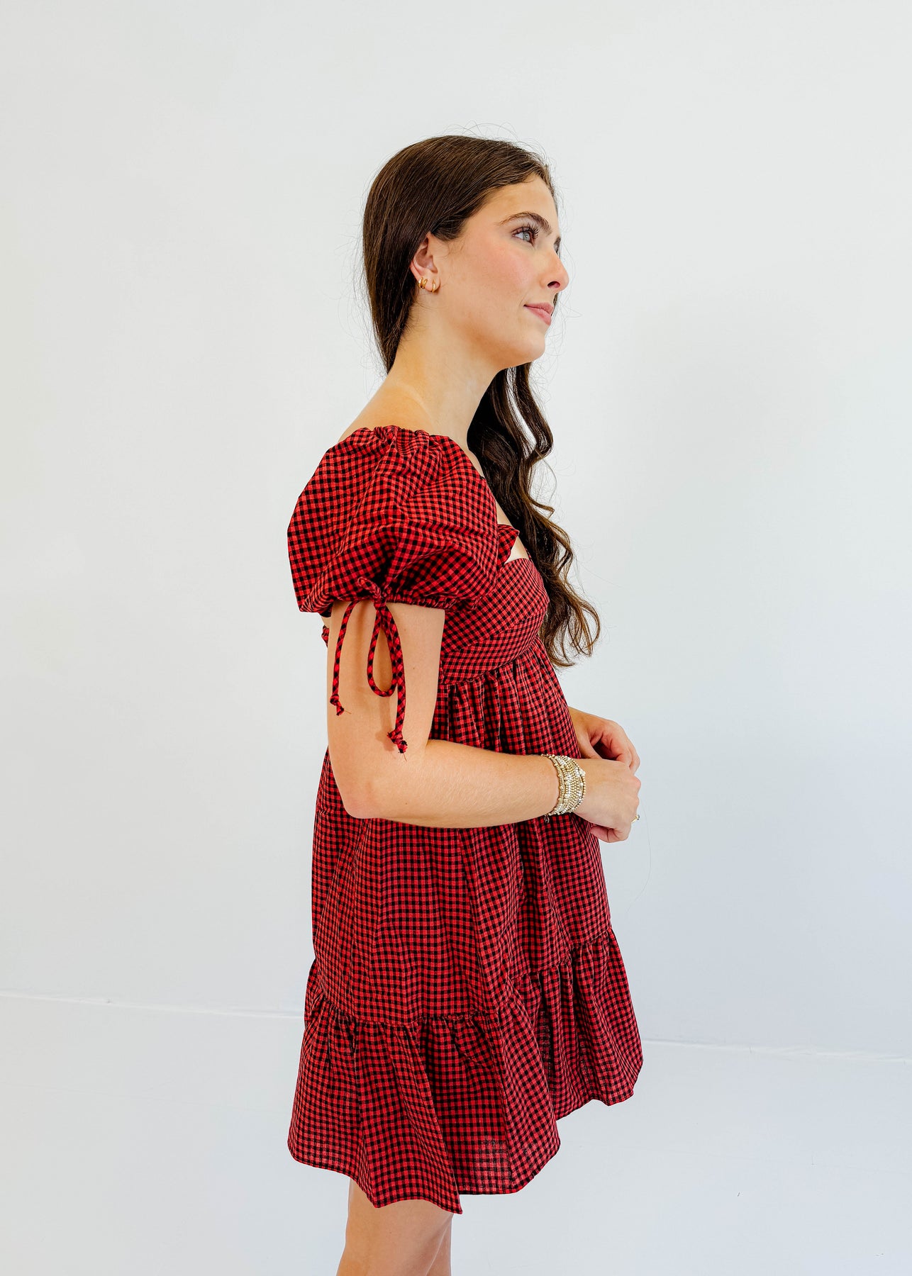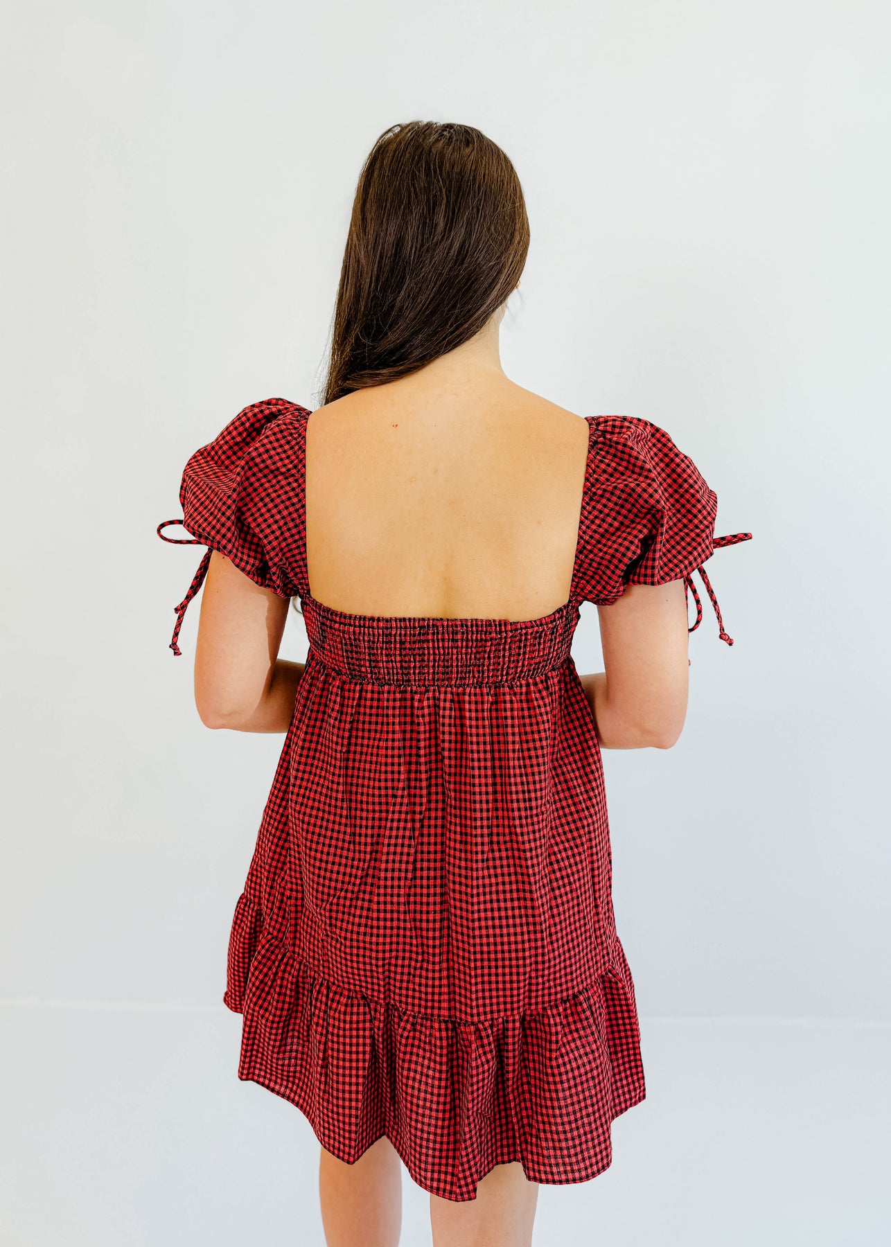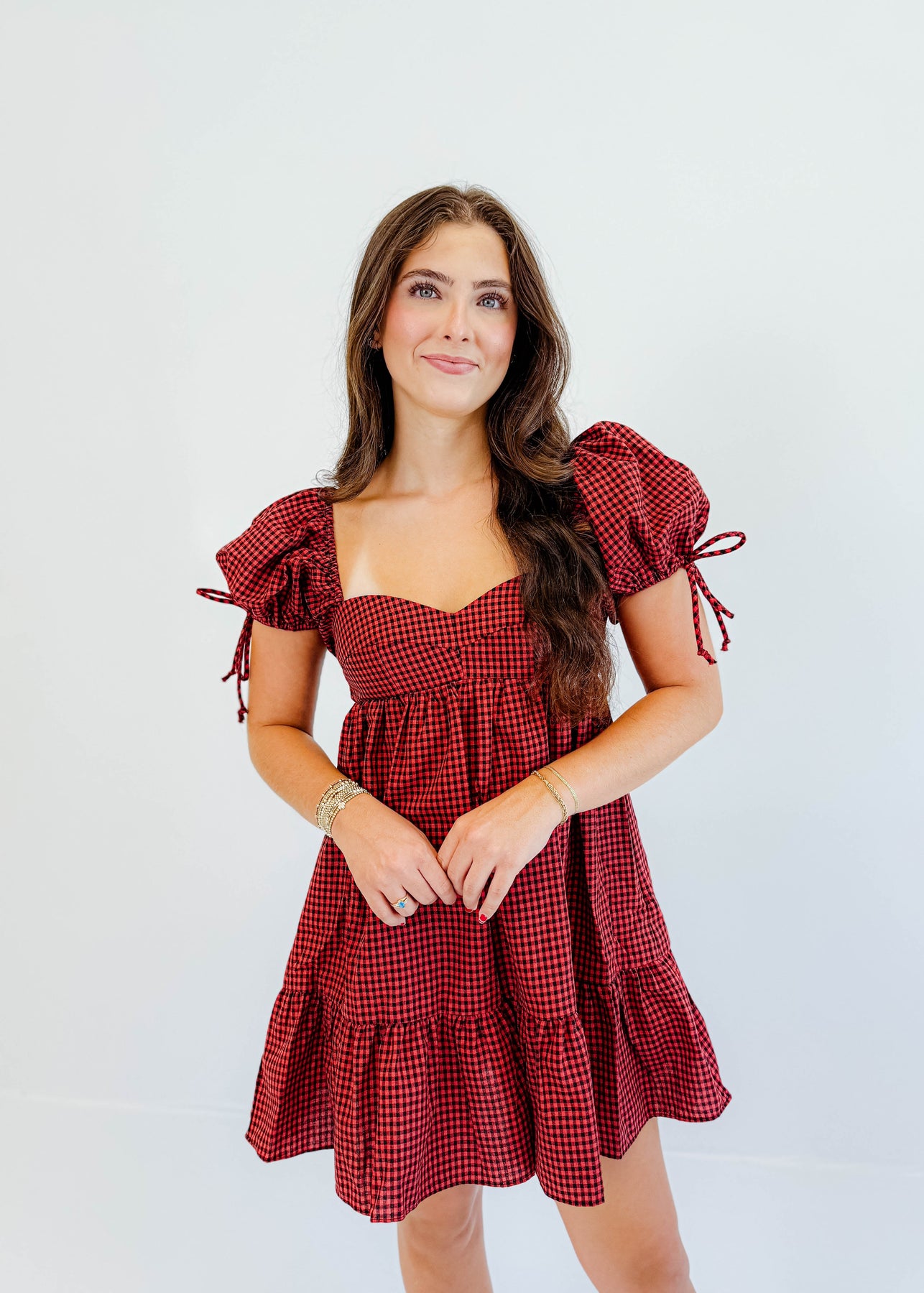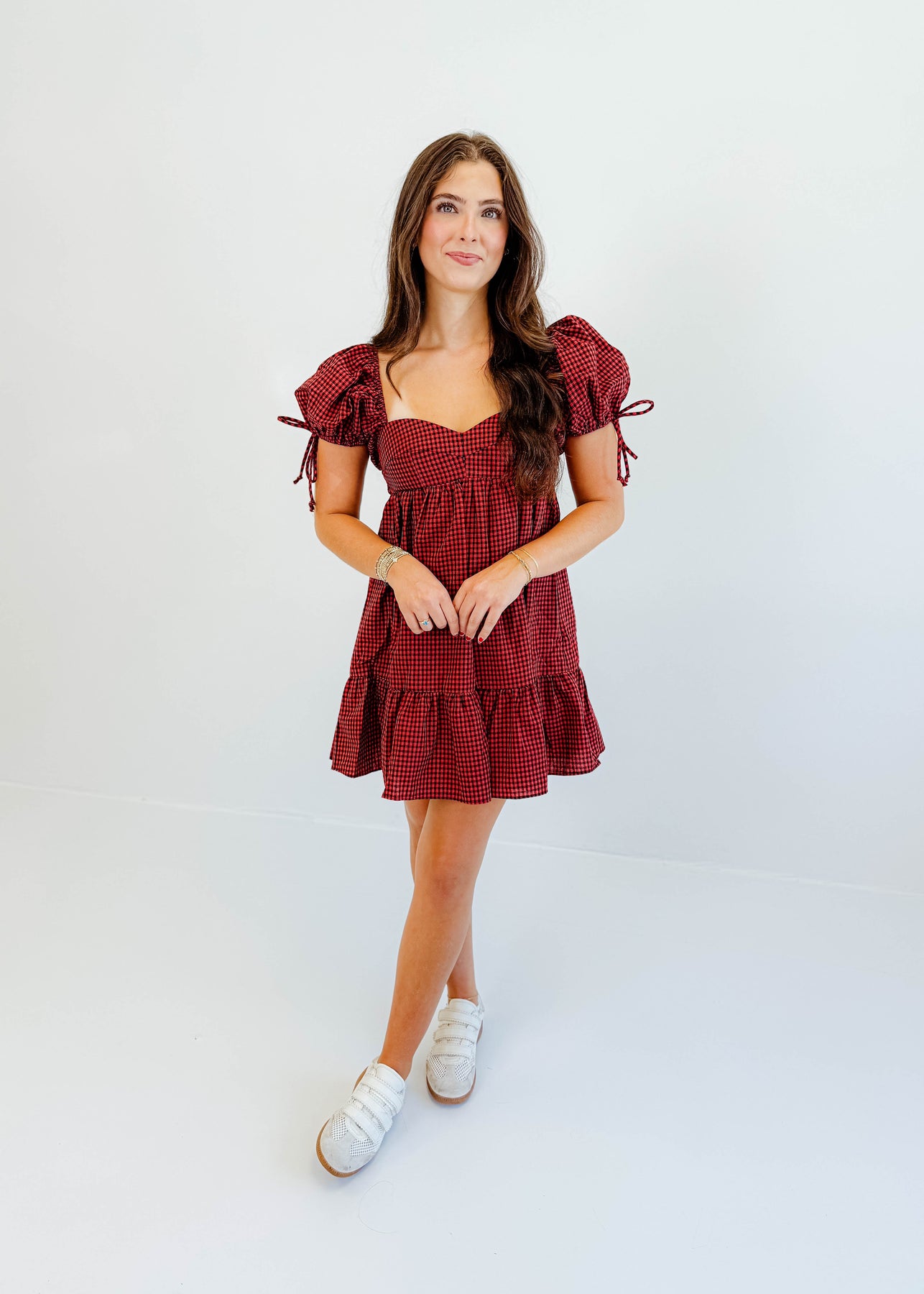 The Clara Gingham Babydoll Dress brings timeless charm with a playful twist. Its puff sleeves with delicate tie details frame a flattering sweetheart neckline, while the tiered skirt adds just the right amount of movement for any occasion. The classic gingham pattern gives it a nostalgic yet modern vibe, making it easy to style for casual days or dressed-up moments. Pair Clara with flats for an afternoon stroll or heels for a night out — she’s the kind of dress you’ll reach for again and again.