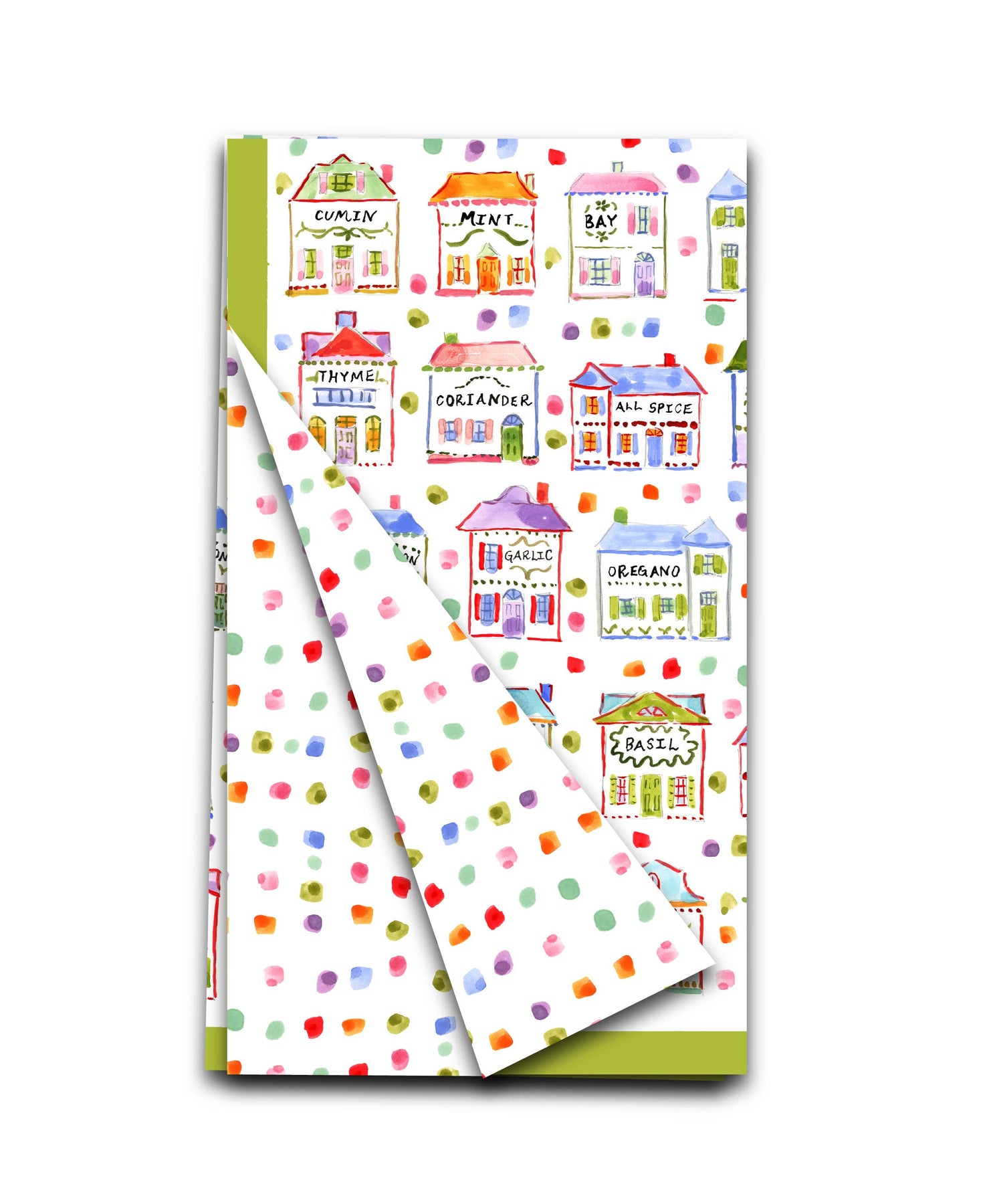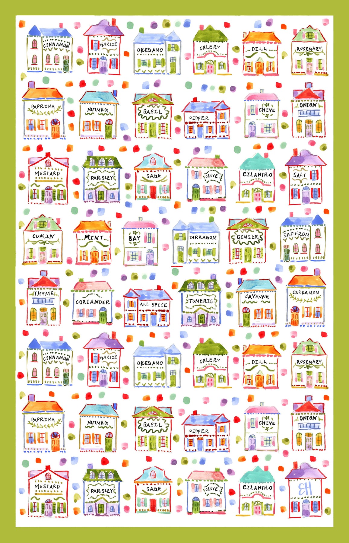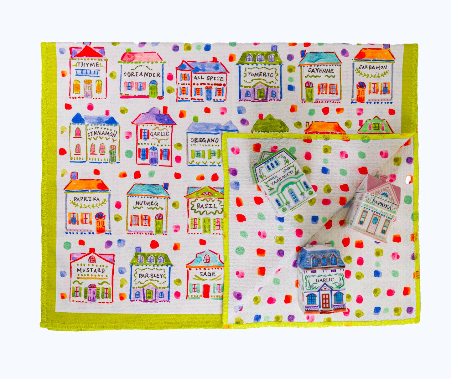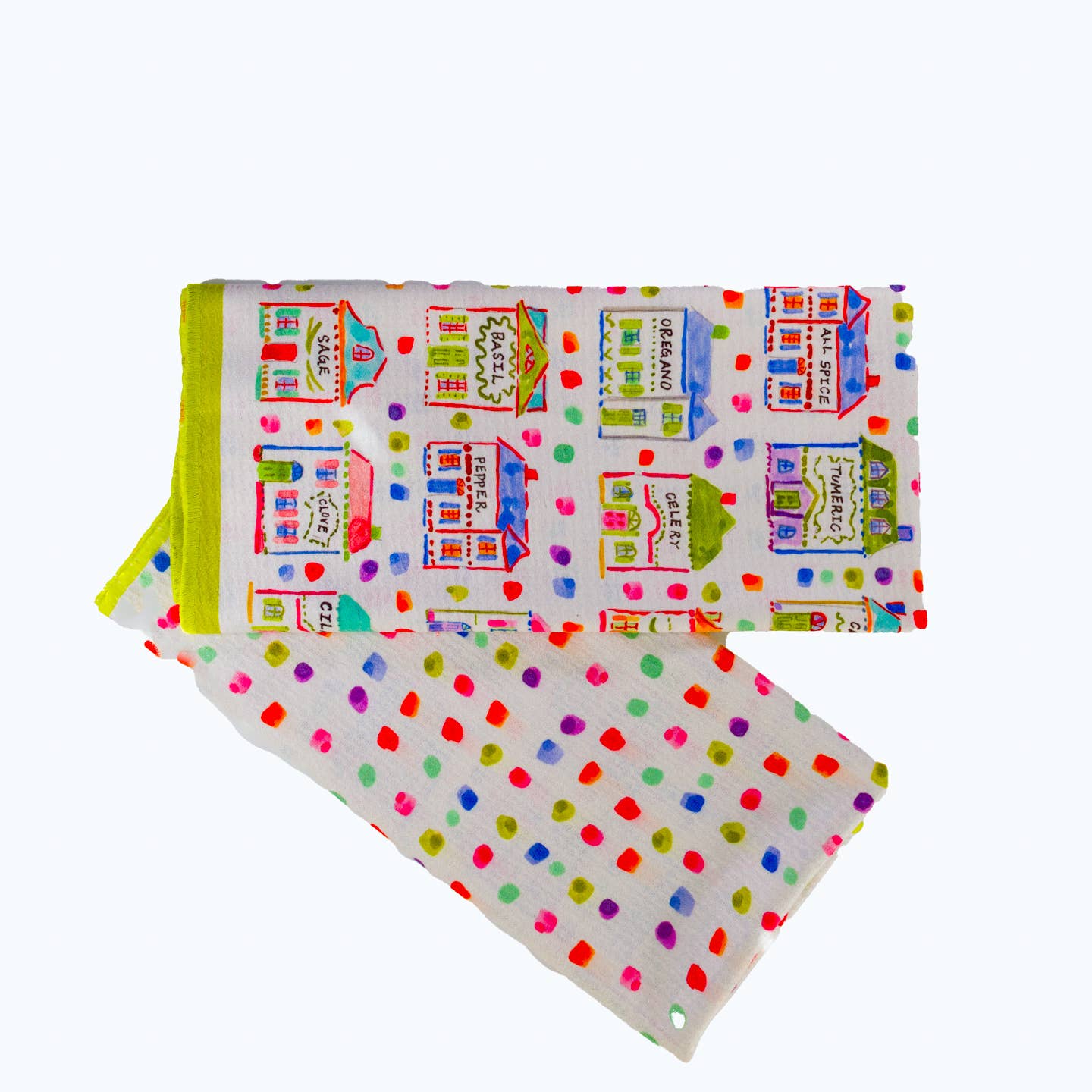 Experience the vibrant charm of the Double Sided Spice Village Tea Towel, featuring original artwork by talented female artists. Crafted from eco-friendly, post-consumer recycled materials, this 18"x27" towel offers superb absorbency and quick drying thanks to its innovative wave weave fabric. With two colorful designs in one, it brightens your kitchen and stays vivid wash after wash. Embrace sustainability and style with a towel that blends functionality and artistic flair effortlessly.