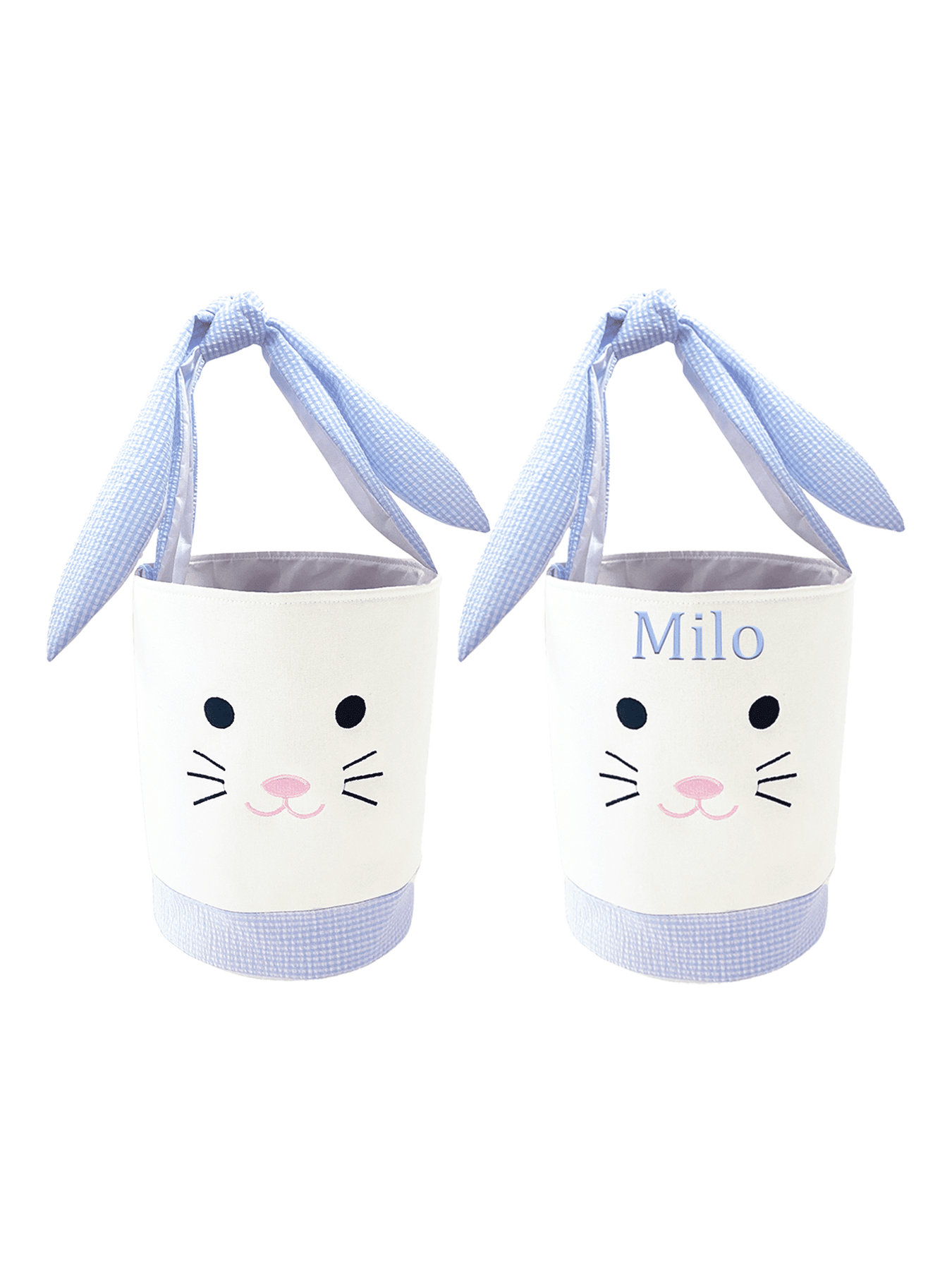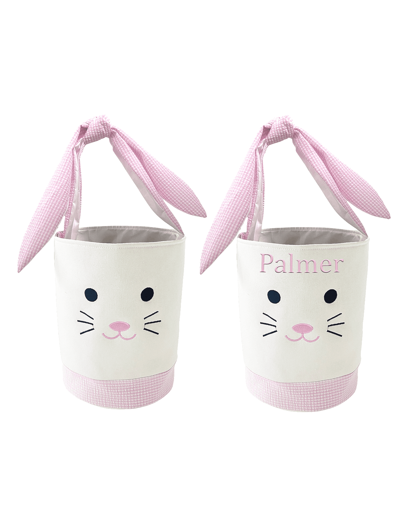 The sweetest Easter baskets are here! These Easter baskets feature a bunny face on canvas with gingham bunny ears and a canvas strap. Choose from pink, blue, lavender or green! Add a monogram & make this extra special!