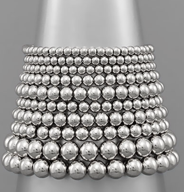 Don't miss this best seller from Swank! This set of 10 stretchy bracelets feature ball-shaped beads, allowing you to mix and match with other accessories. Each bracelet comes in either silver or gold, making it perfect for everyday wear. Durable and stylish, these bracelets are a great way to accessorize your look. Great for layering, this set of ten stretch beaded bracelets is our go to accessory!