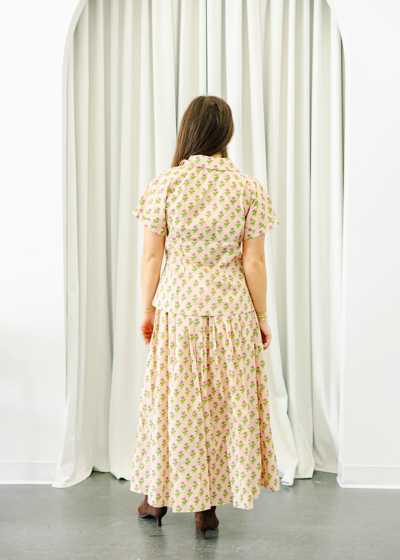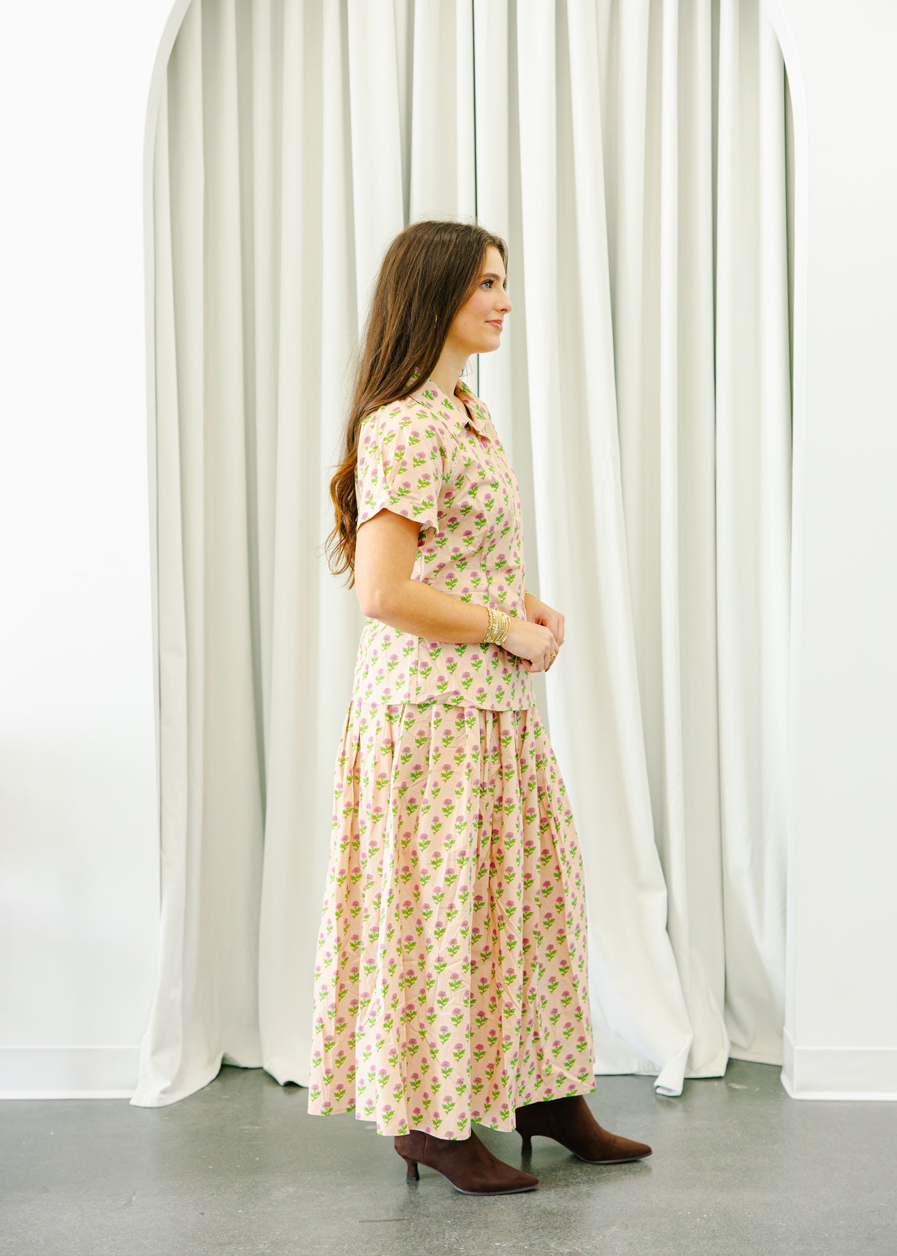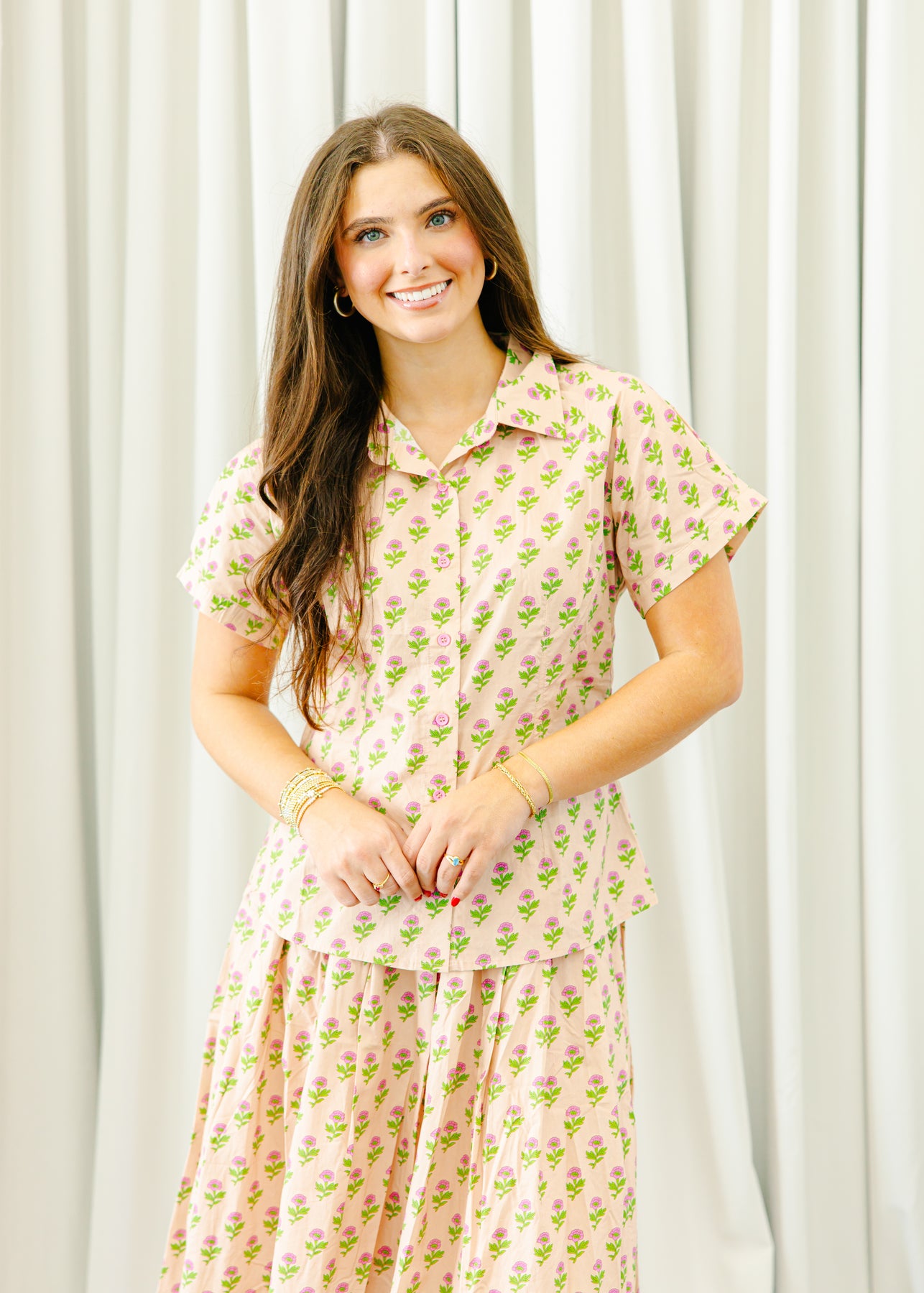 This floral button-down blouse is a charming piece that blends classic style with feminine details. Featuring short sleeves and a tailored fit, it creates a flattering silhouette perfect for pairing with skirts, trousers, or denim. The delicate floral print adds a soft, romantic touch, making it ideal for both casual and semi-formal occasions.