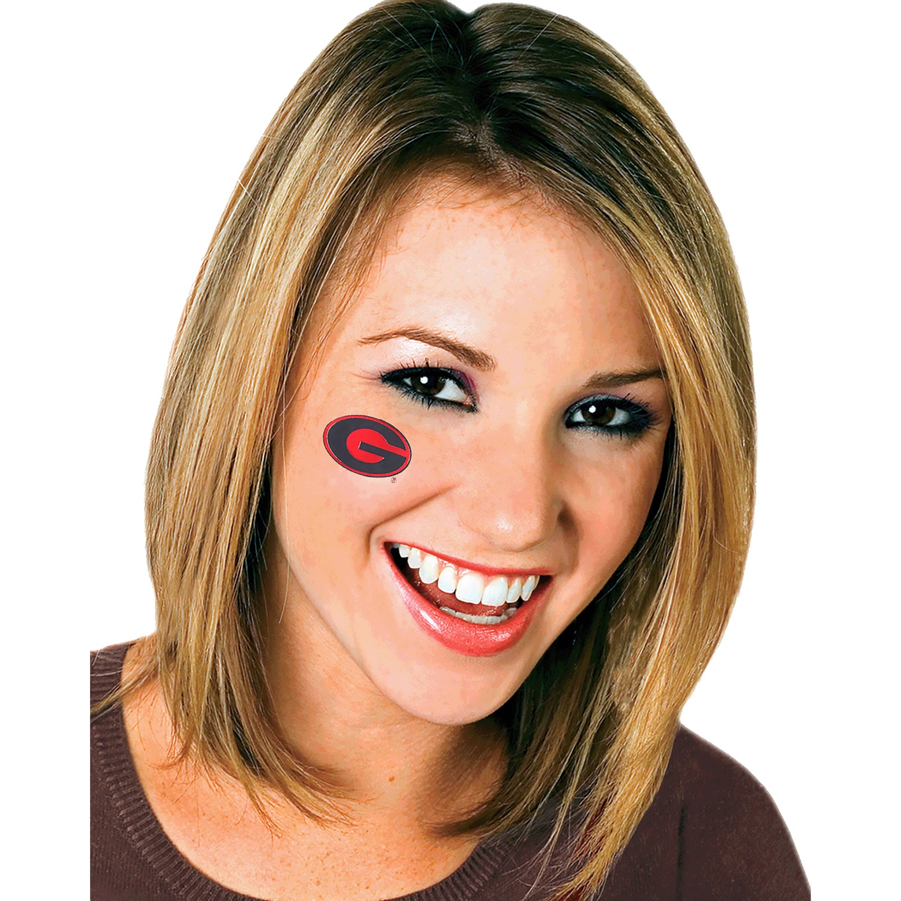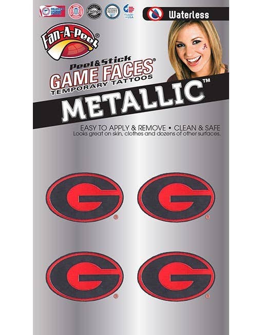 Show off your team pride with Georgia Game Faces® Metallic Temporary Tattoos. Featuring eye-catching holographic foil, each set includes four easy-to-apply tattoos measuring about 1.25" square. Designed on skin-safe tape, they stick on smoothly and peel off without hassle—perfect for game day excitement that lasts as long as you do.