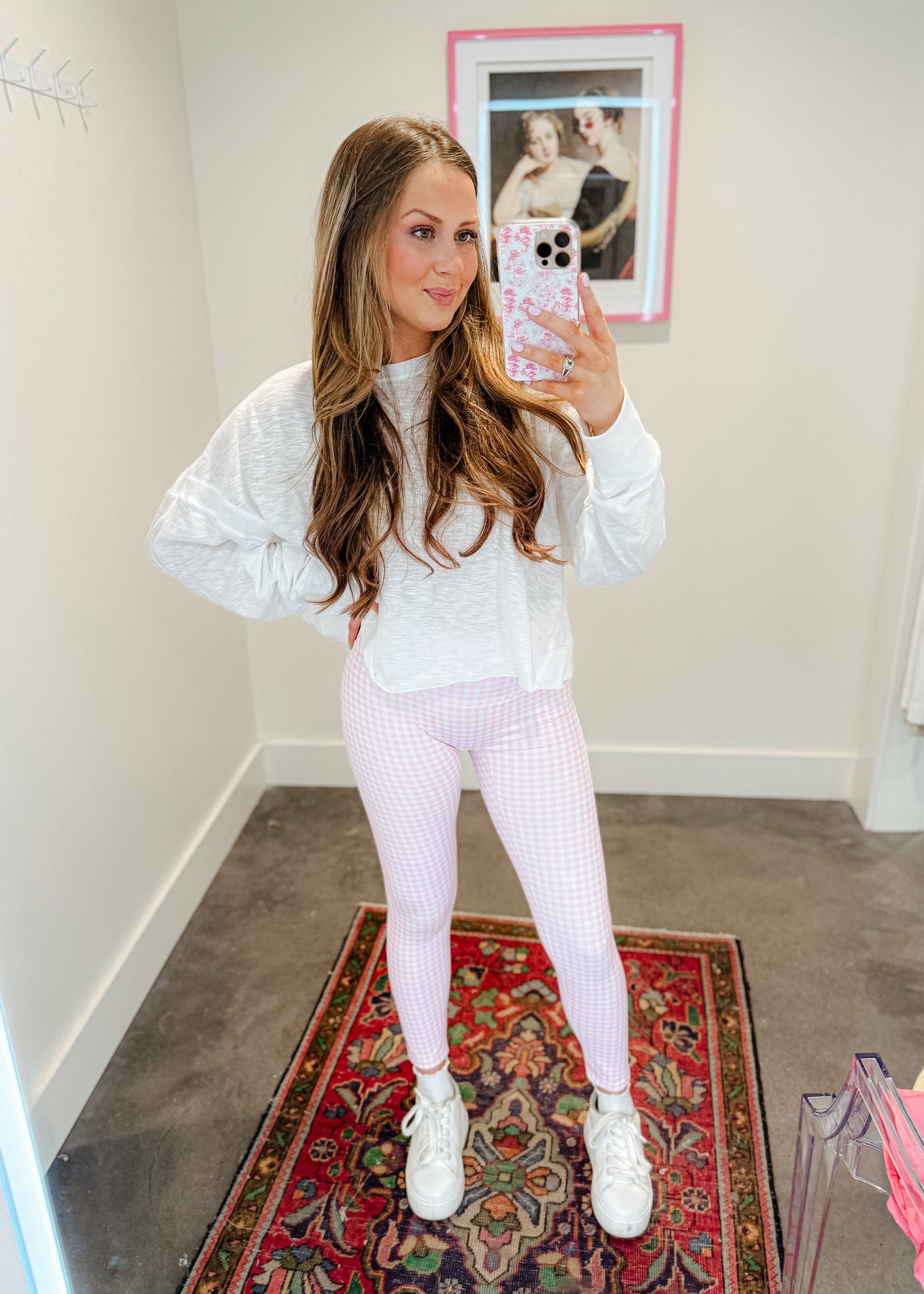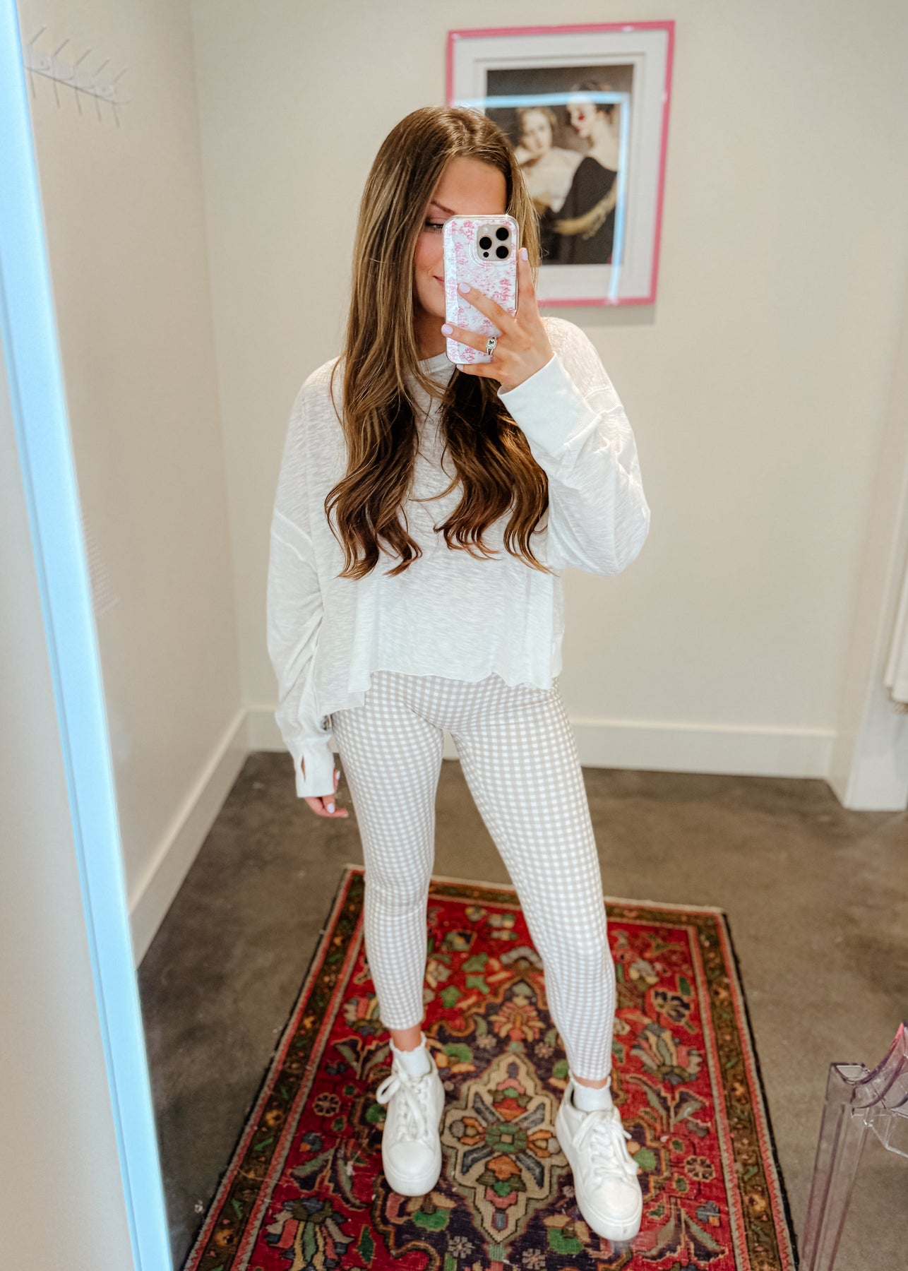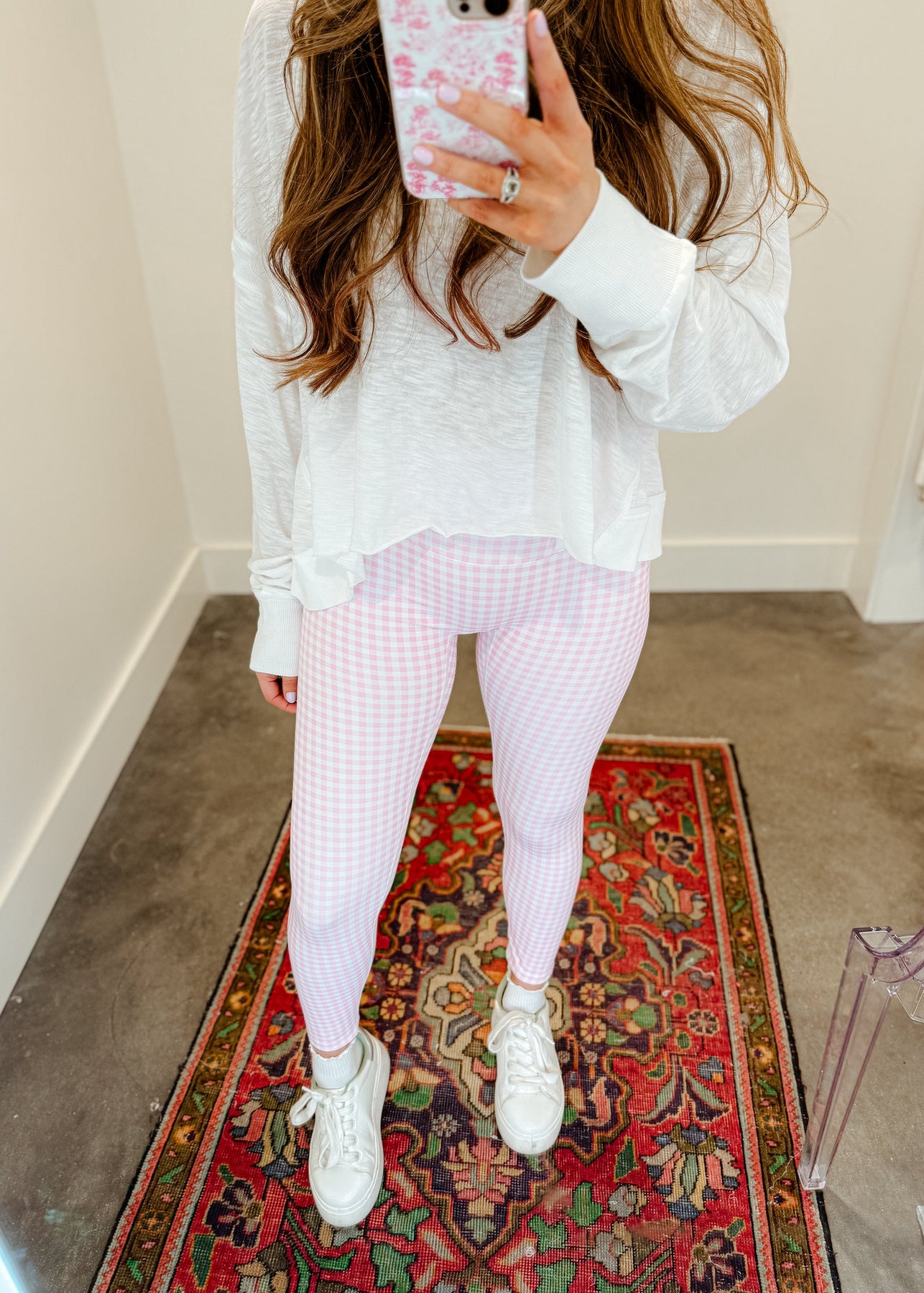 Step up your legging game with our Gingham Performance High Rise Leggings! The gingham print adds a touch of style to your workout wardrobe while the high-rise cut provides a flattering, seamless look. Our quick-drying fabric with four-way stretch technology keeps you comfortable and cool during even the most intense workouts. Don't sacrifice fashion for performance, get the best of both worlds with our weightless breathable brushed soft leggings.