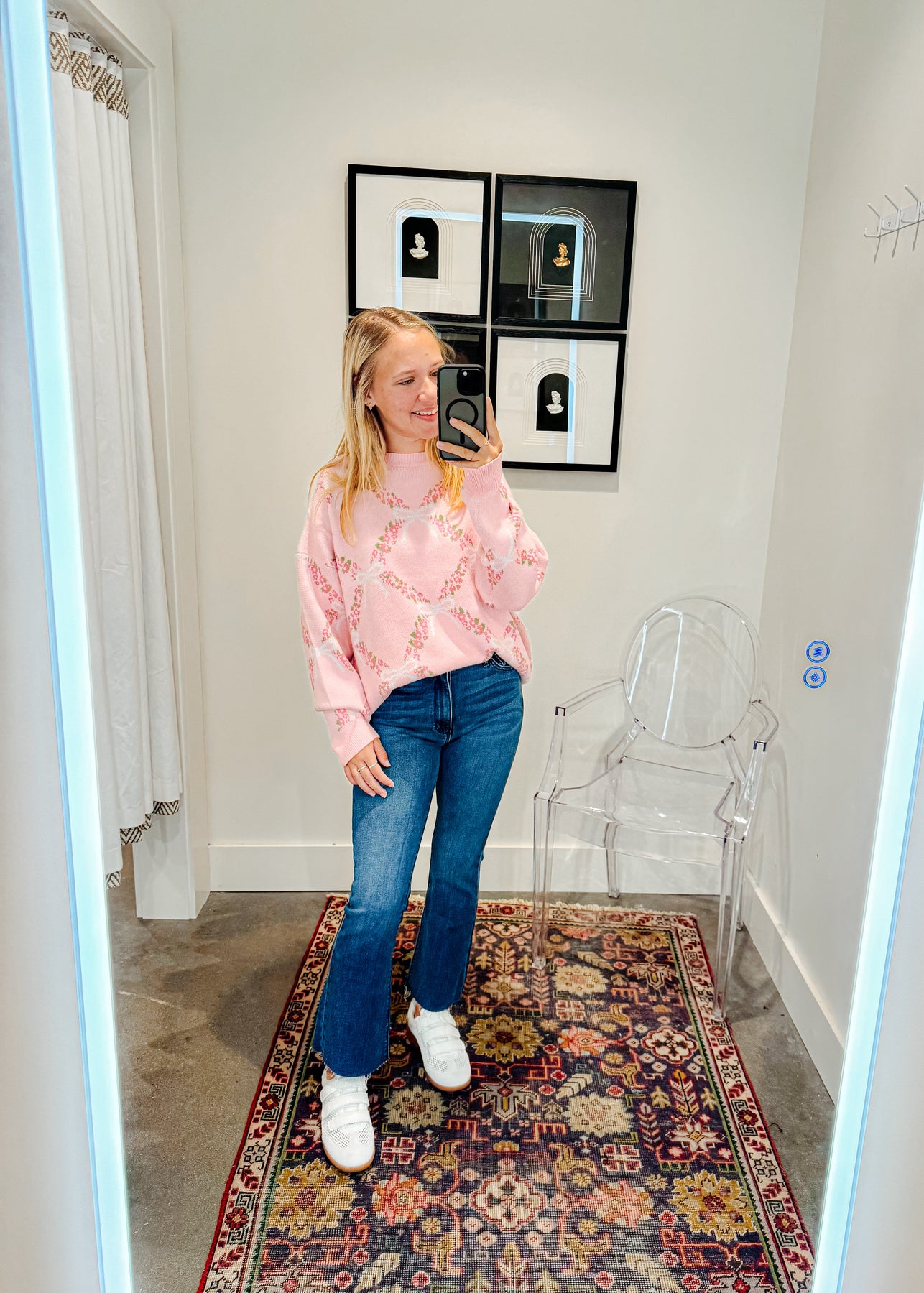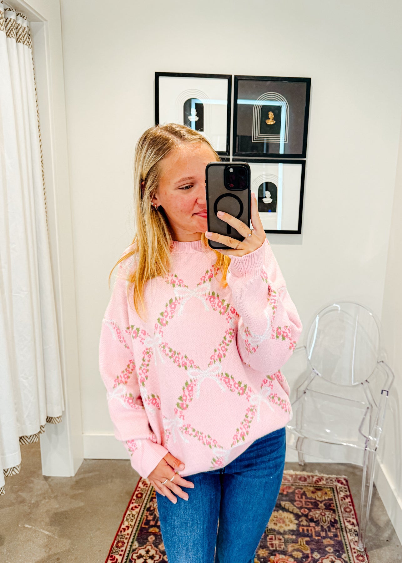 Cozy up in Isla Floral Knit Sweater's sweet side. This soft pink sweater is sprinkled with delicate floral bow garlands in a lattice design. The relaxed fit and drop shoulder detail give it a casual, comfy vibe while still keeping things ultra-feminine. Pairs perfectly with lace, denim, or a warm cup of tea.