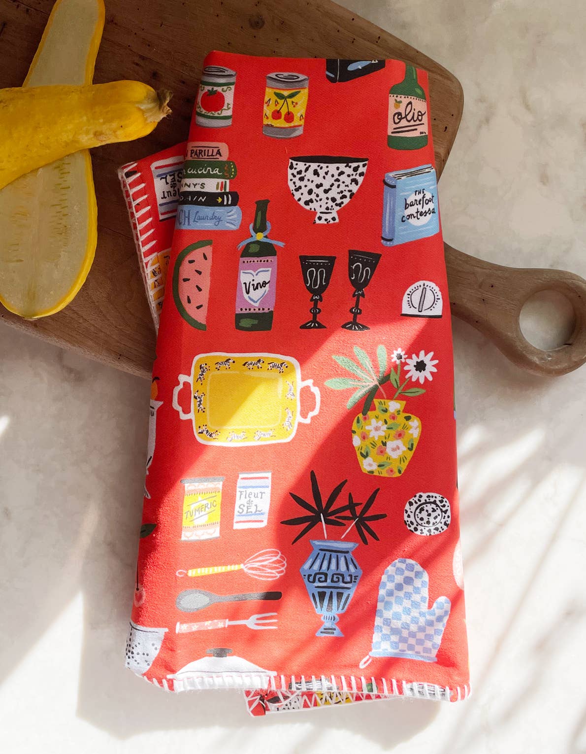 Our vibrant tea towels are just the thing to add a touch of colorful flair to your kitchen, or a thoughtful hostess/housewarming gift! Woven from 100% absorbent cotton and printed with our charming, hand-painted designs, each towel is embellished with contrasting embroidery along the seaming.