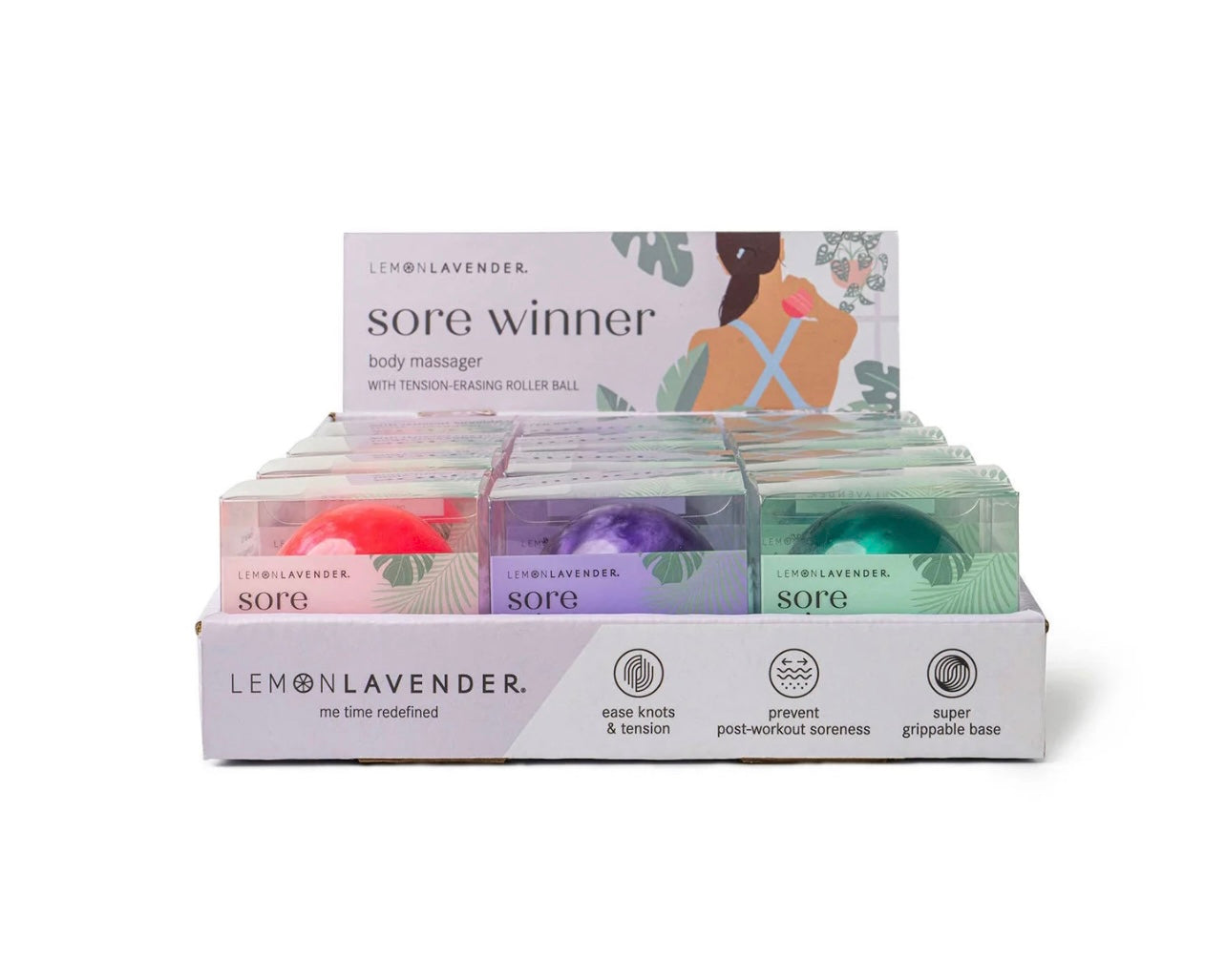 Soothe sore muscles and relieve tension with the Lemon Lavender Sore Winner. This hand-held muscle roller ball helps melt away knots and prevent post-workout soreness. With a grippable base, it's easy to use and perfect for on-the-go recovery. Feel rejuvenated and refreshed with every use.