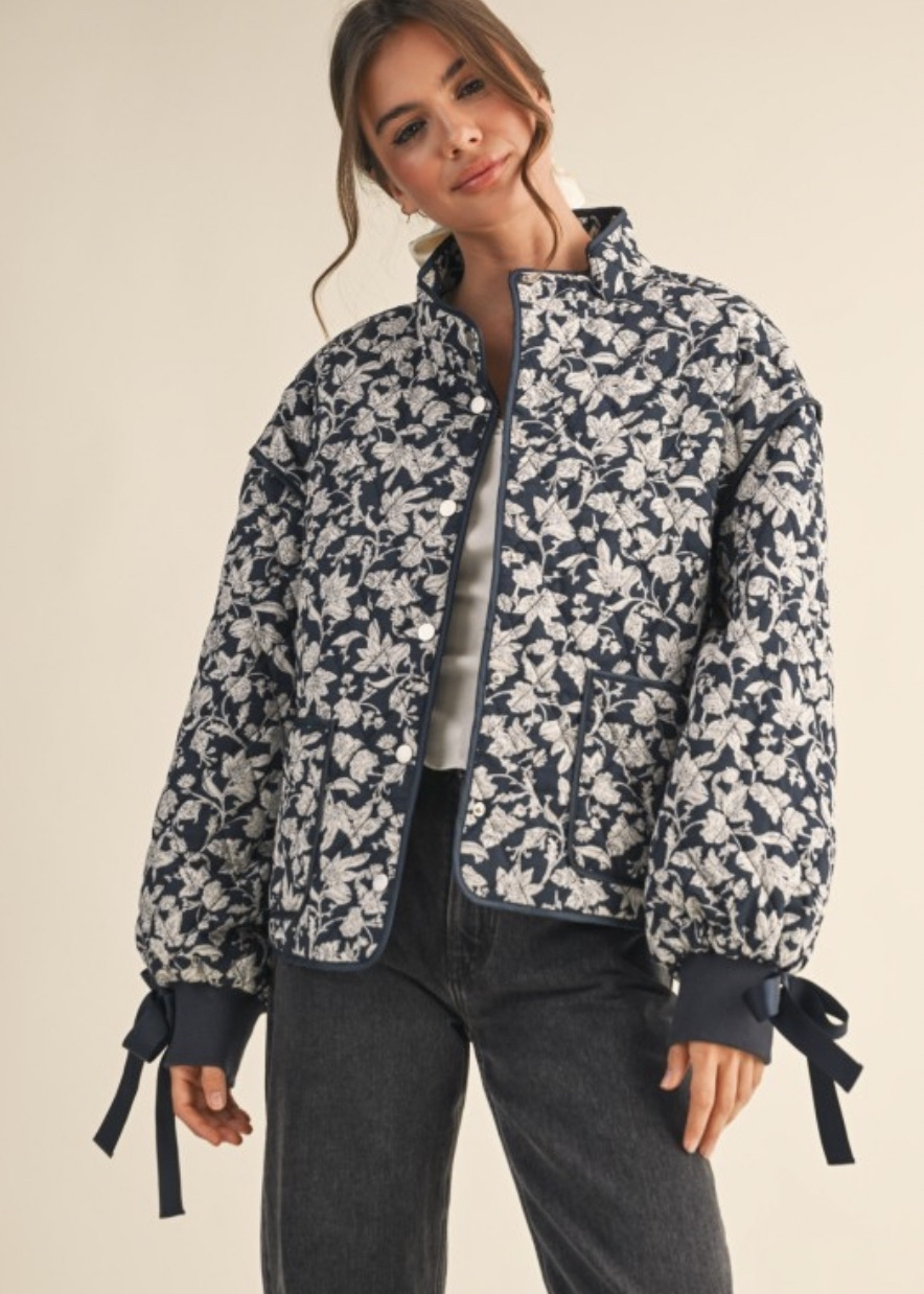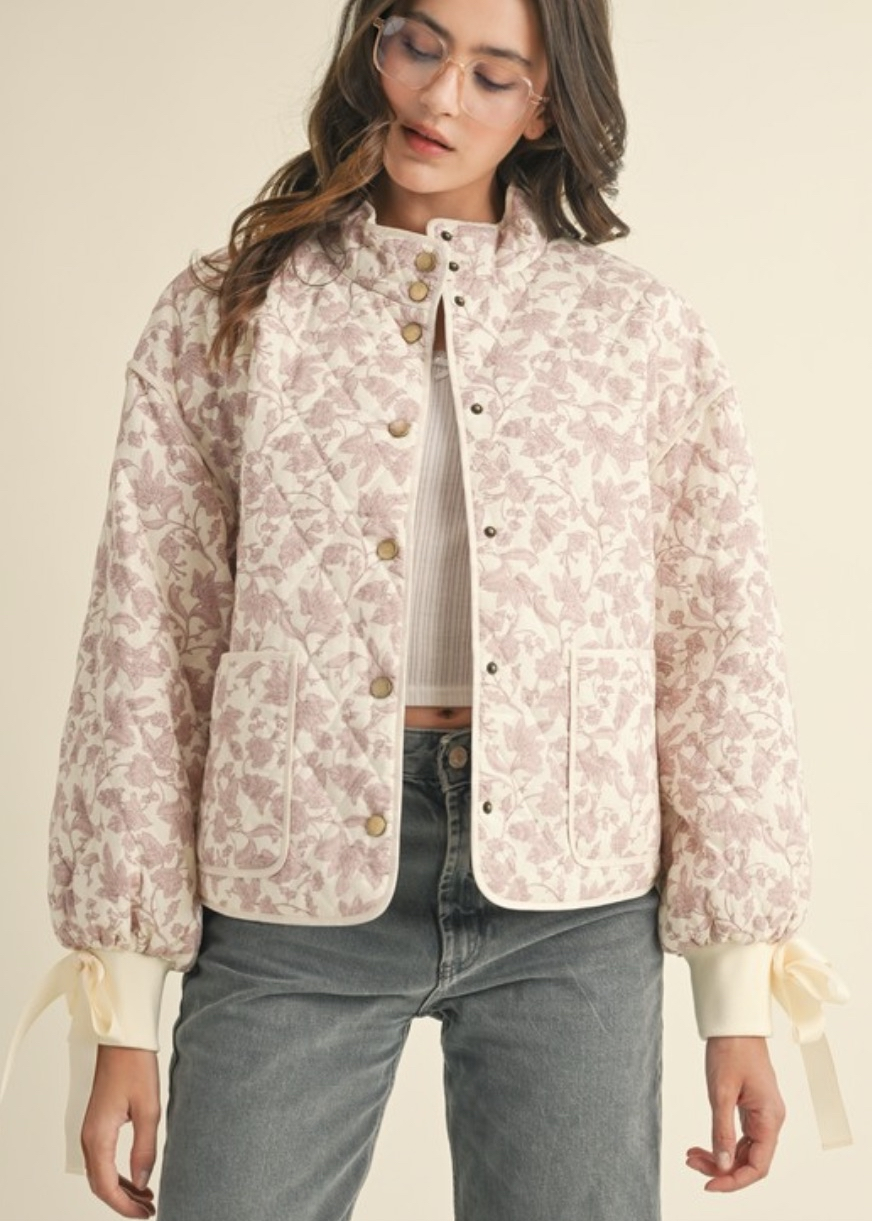 This lightweight quilted jacket brings a sweet, polished touch to cooler days. The soft quilting adds just enough warmth without feeling bulky, while the ribbed cuffs keep the fit comfortable and snug. Finished with a charming bow embellishment, it blends everyday practicality with a hint of feminine flair. The perfect throw-on layer for errands, outings, or adding a pretty accent to your fall and winter looks.