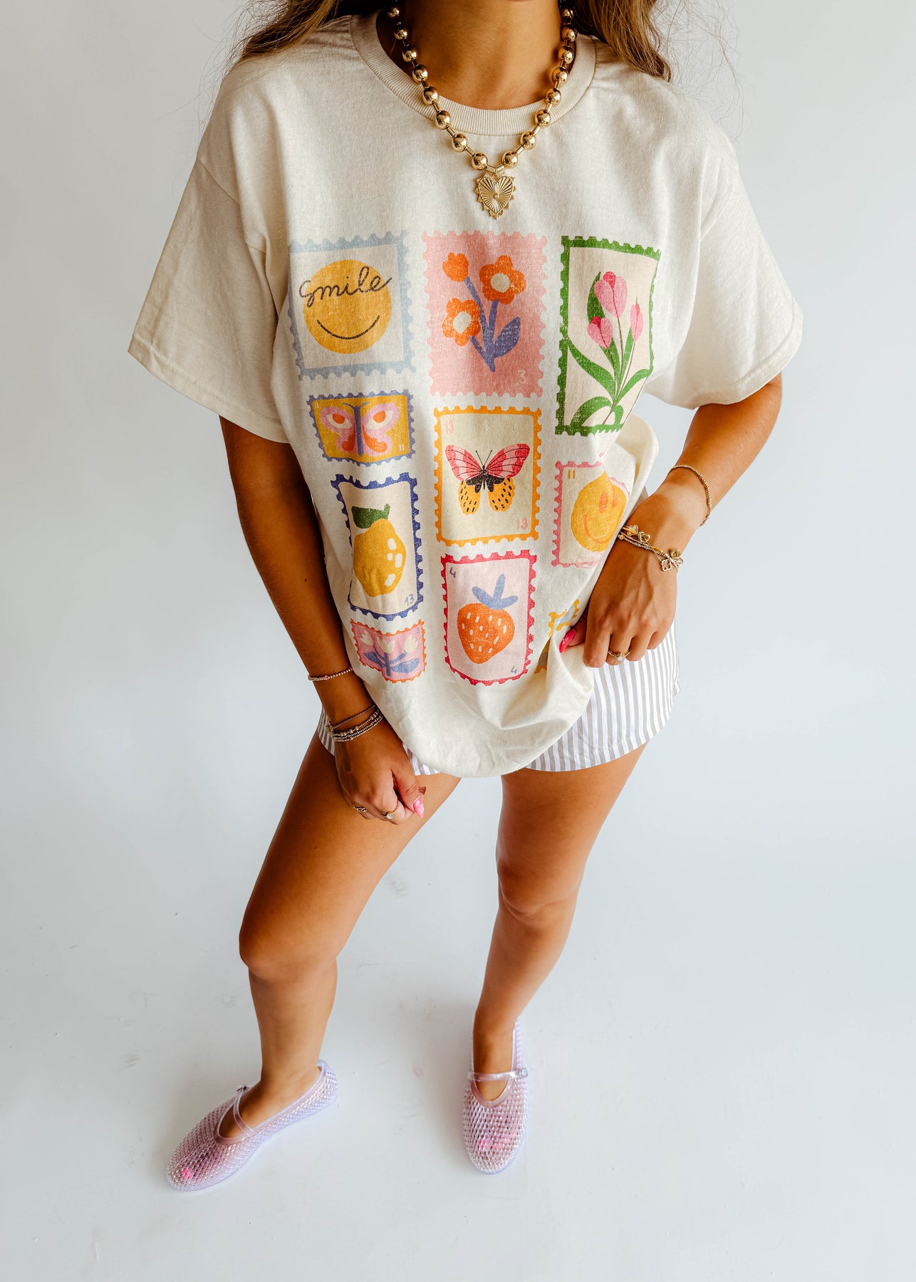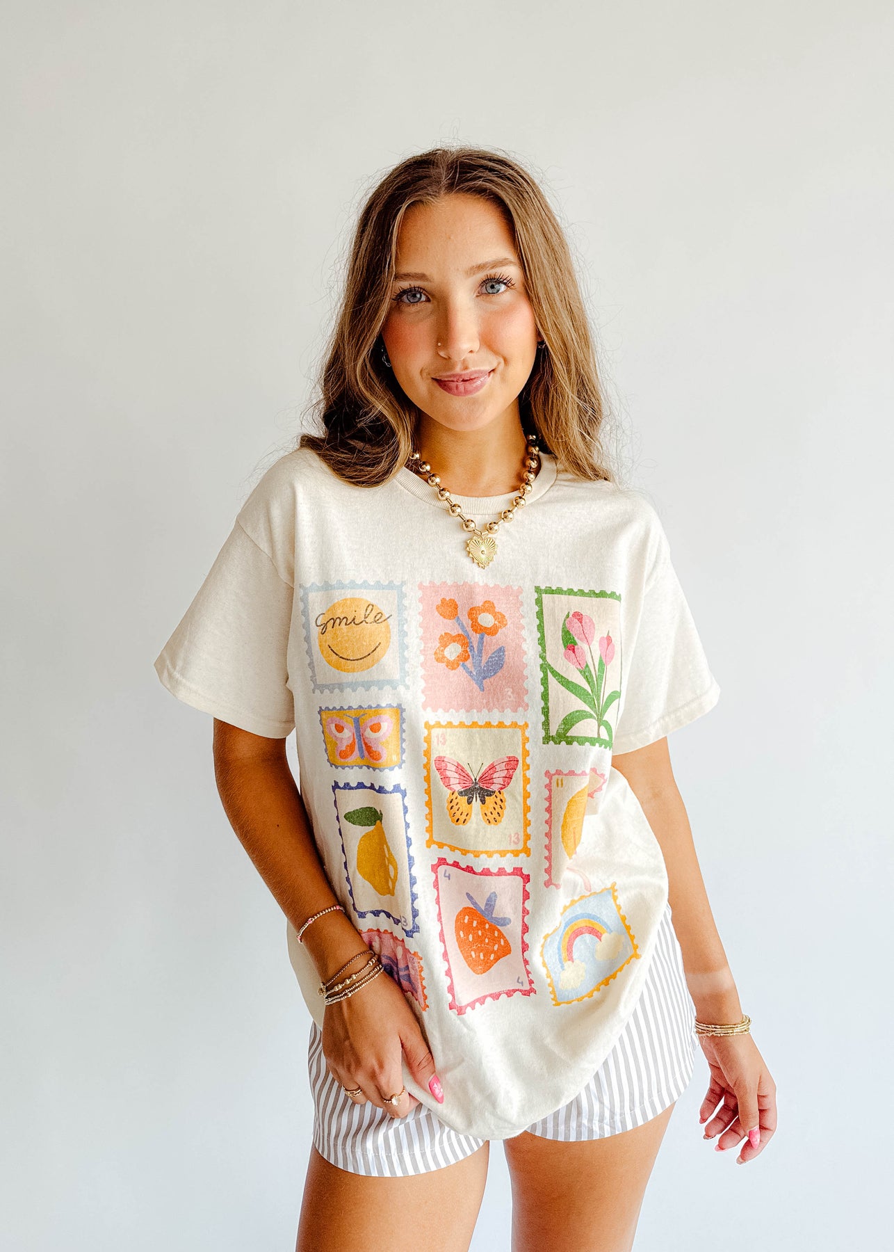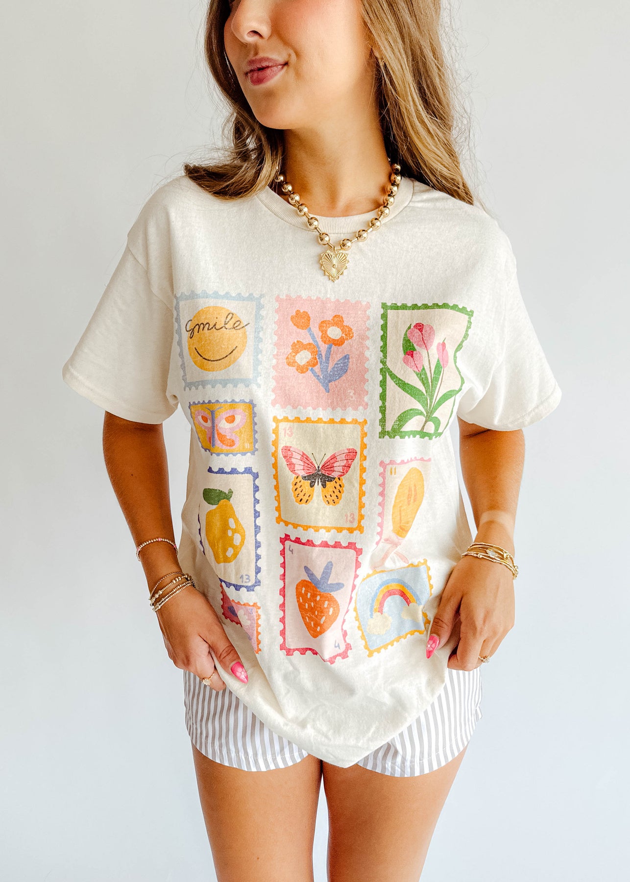 The Luna Good Vibes Stamps Graphic Tee is bursting with cheerful energy and playful nostalgia. Featuring a grid of vintage-inspired stamp illustrations—think smiley faces, butterflies, florals, and rainbows—it’s a wearable mood booster. The relaxed fit and soft cotton feel make it an easy favorite for laid-back days. Whether you wear it oversized as a tee dress or tucked into your go-to denim, Luna delivers feel-good vibes every time.