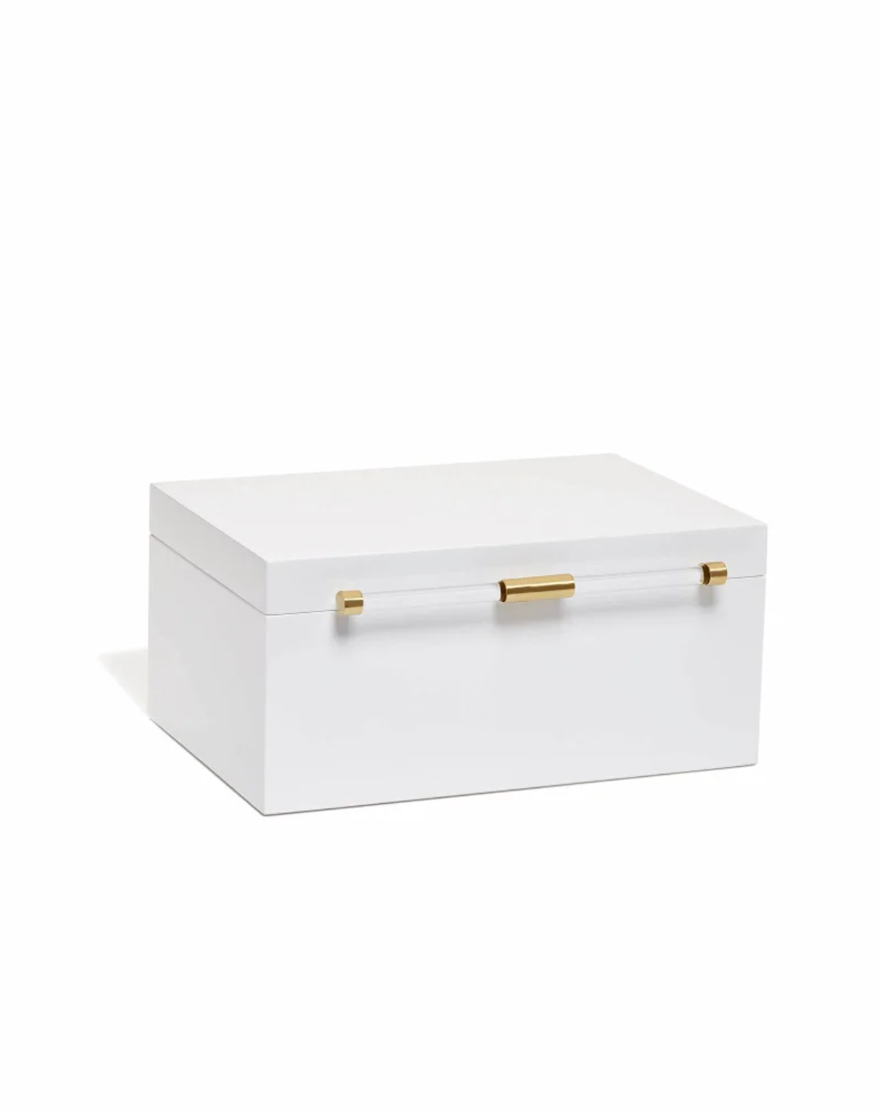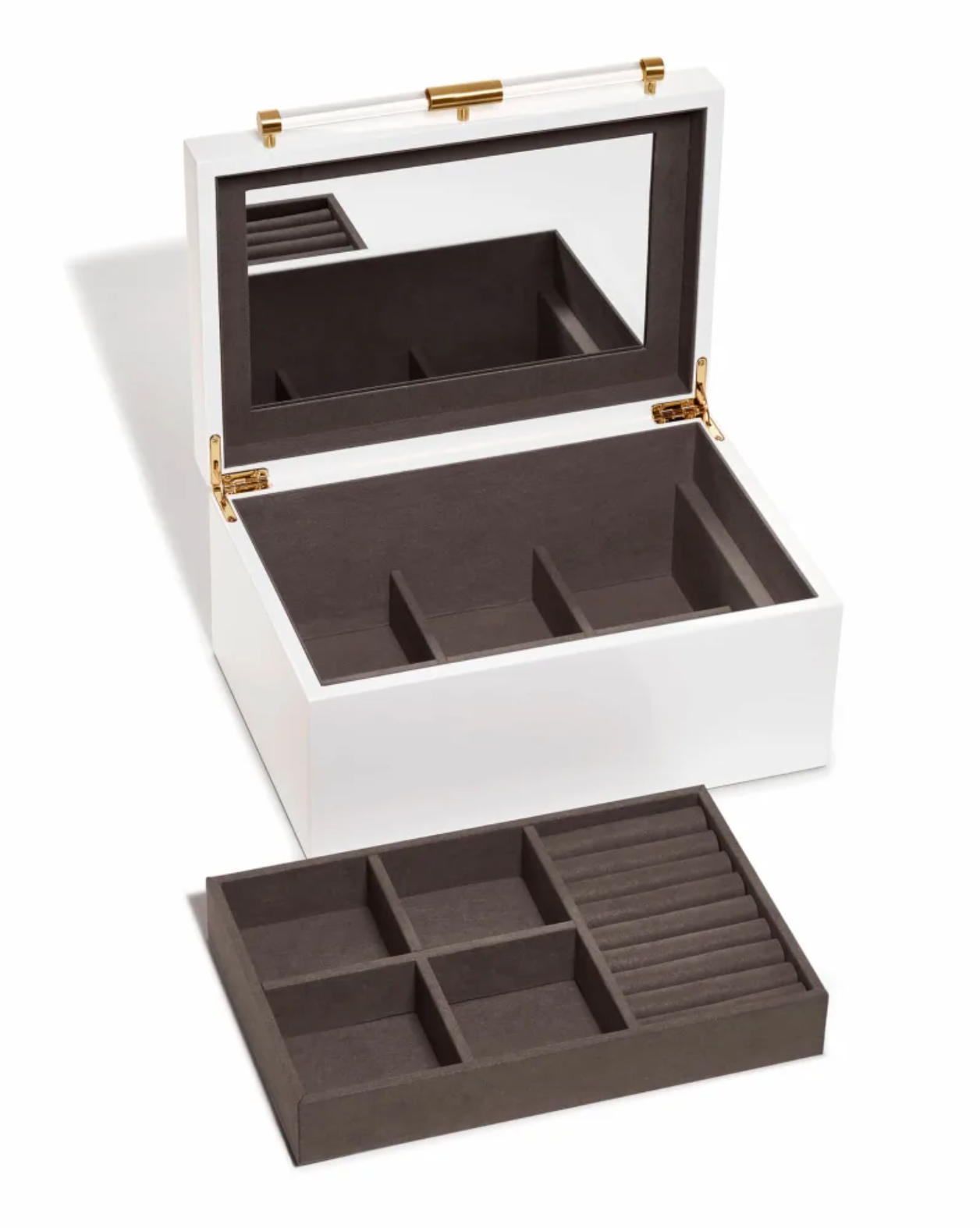 Keep all of your jewels organized in the Kendra Scott Medium Antique Brass Jewelry Box! This jewelry box features a mirror, drawer dividers, and a bottom compartment.