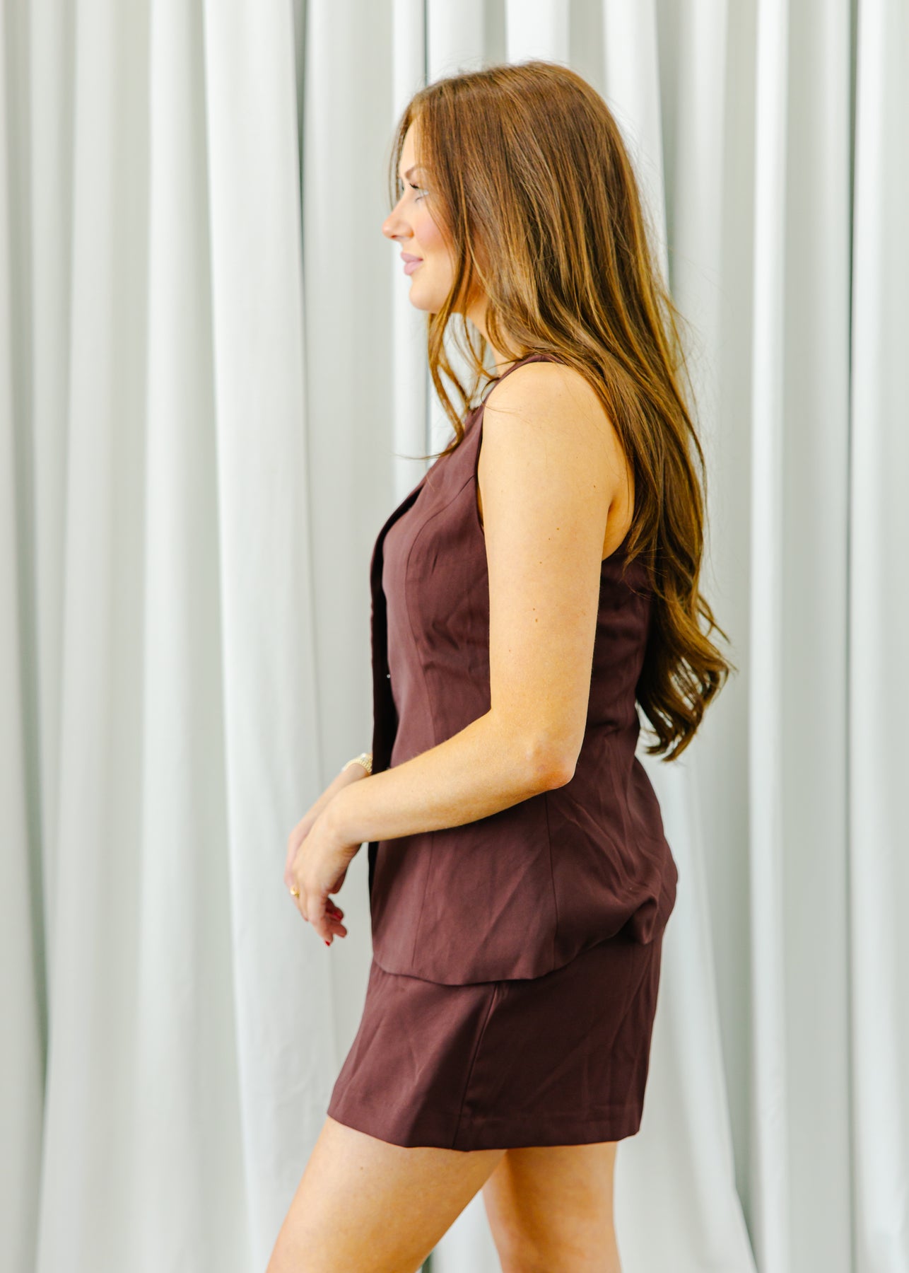 This chic romper combines sophistication with playful charm. Designed with a sleeveless cut and a front row of striking gold ring buttons, it offers a modern tailored look that's perfect for both daytime outings and evening events. The asymmetrical hem adds a unique touch, making it a standout piece in your wardrobe. Style it with bold accessories and heels for a polished finish.